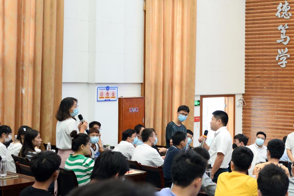 龙飞院长为本次见面会作精彩致辞。他在致辞中说道,希望同学们在学期间能够潜心问学,有所建树,切莫虚度光阴。随后,教师代表刘来君、刘远立、陈秀丽老师,毕业学生代表相怀成、新生代表李学暖分别作主旨发言。他们分别从教学、科研、实验、学习、生活等各方面作经验介绍与交流分享。继而进行师生交流答疑。龙飞院长和在座的各位老师对新生提出的问题逐一作了详细的解答,既解开了新生心中的疑惑也增进了师生的感情。最后,梁军书记为本次见面会作总结讲话。他对同学们提出了殷切希望:希望同学们求学期间能够学会做人、学会做事、学会做学问。