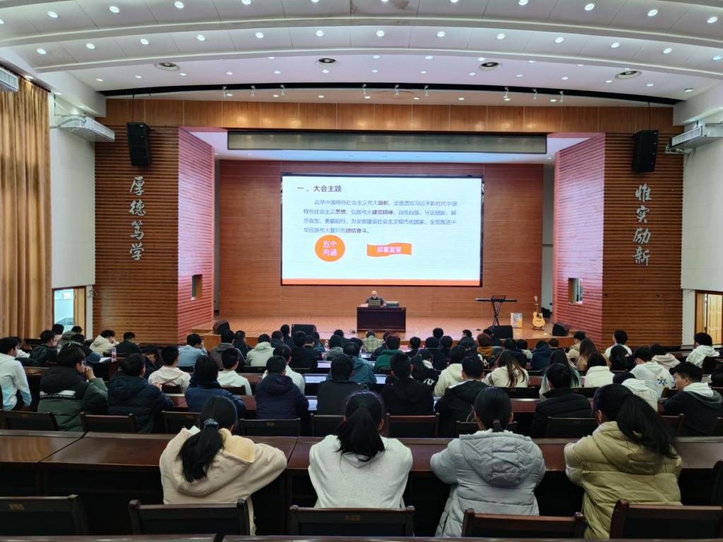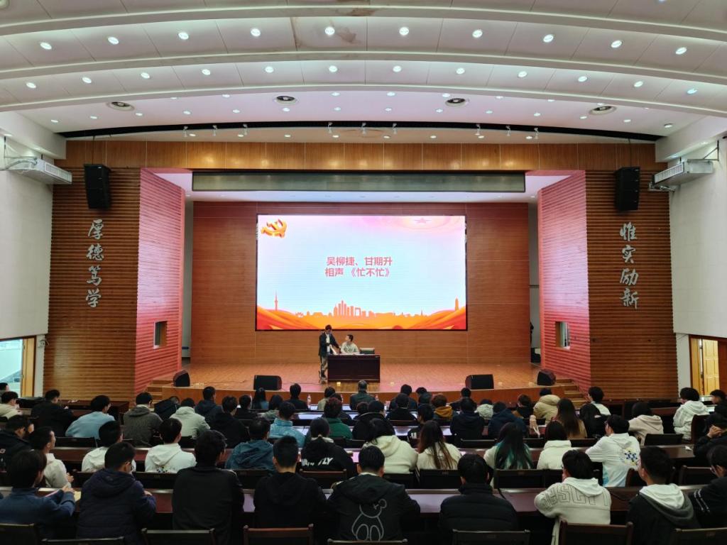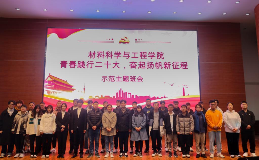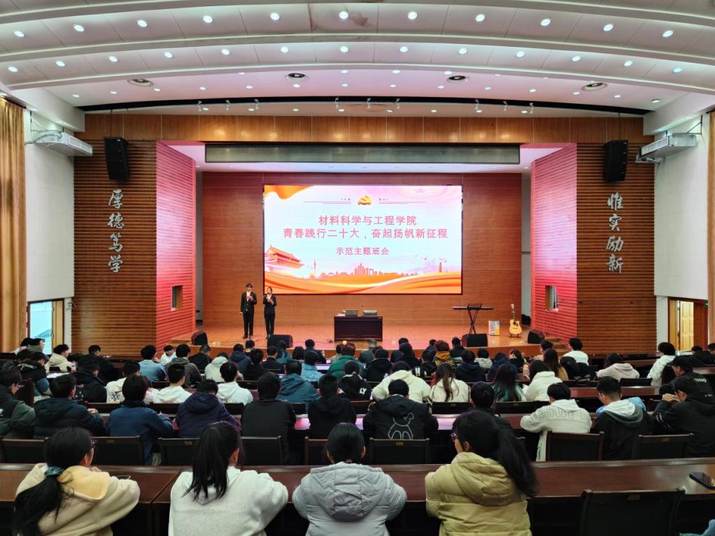 为持续学习宣传贯彻党的二十大精神,教育引导广大学生进一步坚定理想信念,学深悟透习近平新时代中国特色社会主义思想,2月26日上午,我院在屏风校区图书馆报告厅成功开展“青春践行党的二十大,奋起扬帆新征程”示范主题班会,班会邀请到了马克思主义学院副院长蒋晓俊老师、材料学院党委副书记徐时老师、材料学院2021无机实验班班主任姚迪圣老师出席本次活动。班会由2021级苏俊兴和苟海玲两位同学主持。